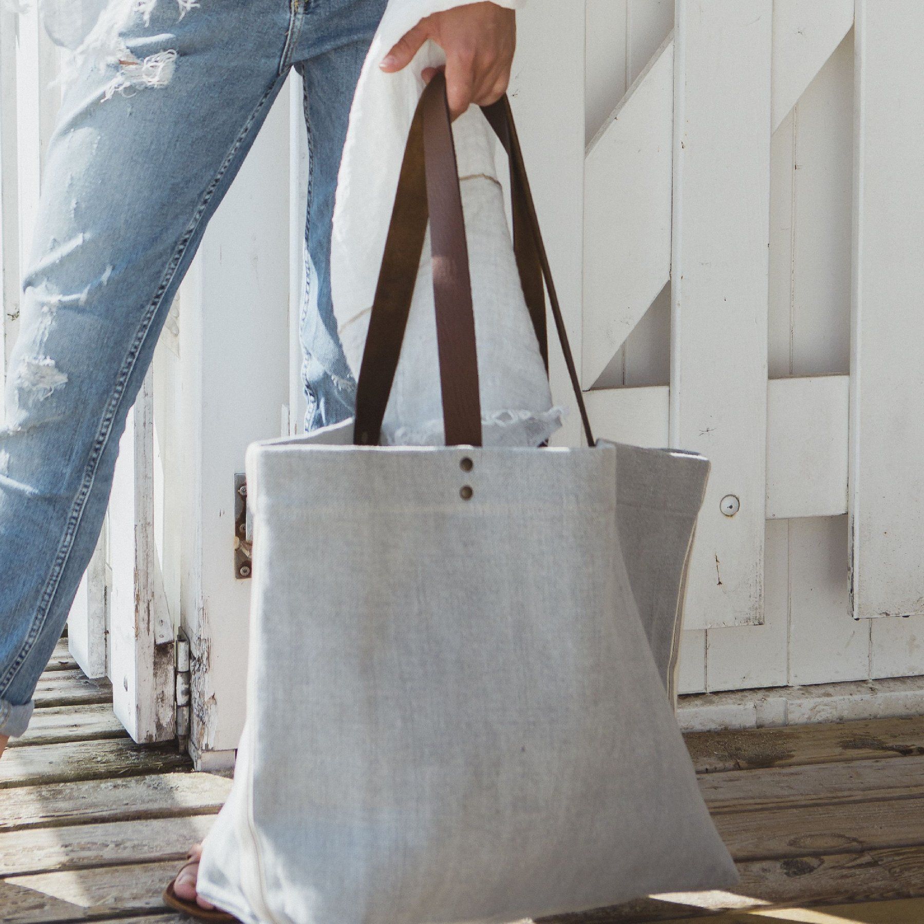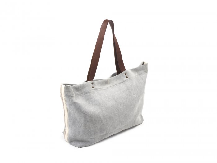 The shoulder bag is lined with an oyster linen and finished on the outside with a striped cotton trim over each side seam, and leather handles. The bag is finished with a 3 snap closure.